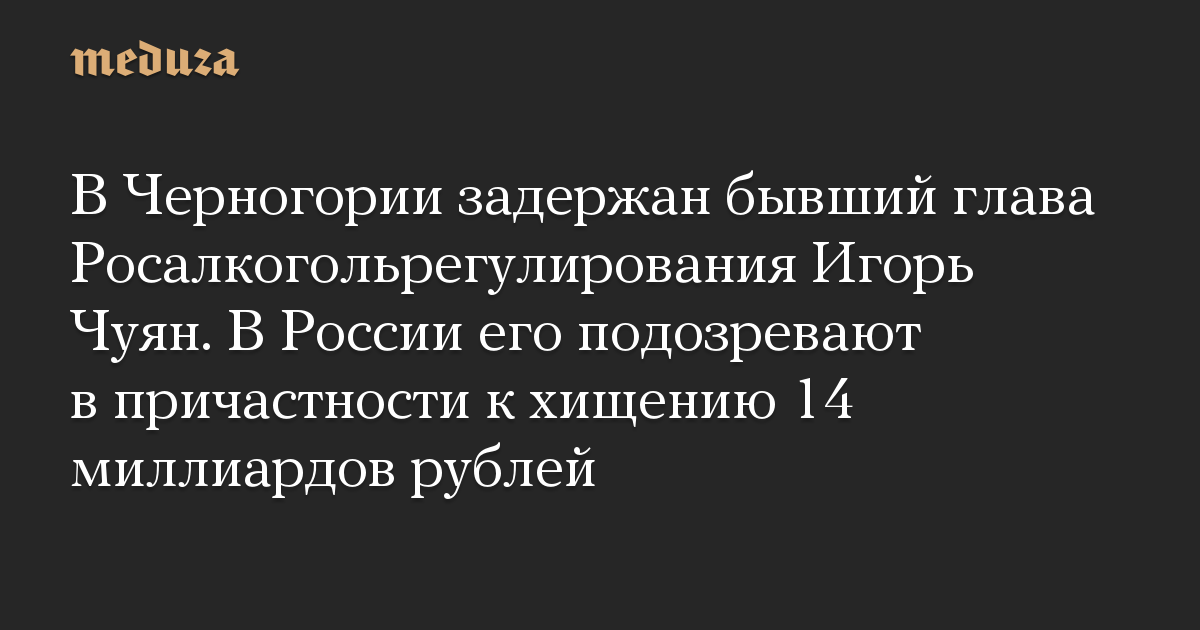 В Черногории задержан бывший глава Росалкогольрегулирования Игорь Чуян. В России его подозревают в причастности к хищению 14 миллиардов рублей