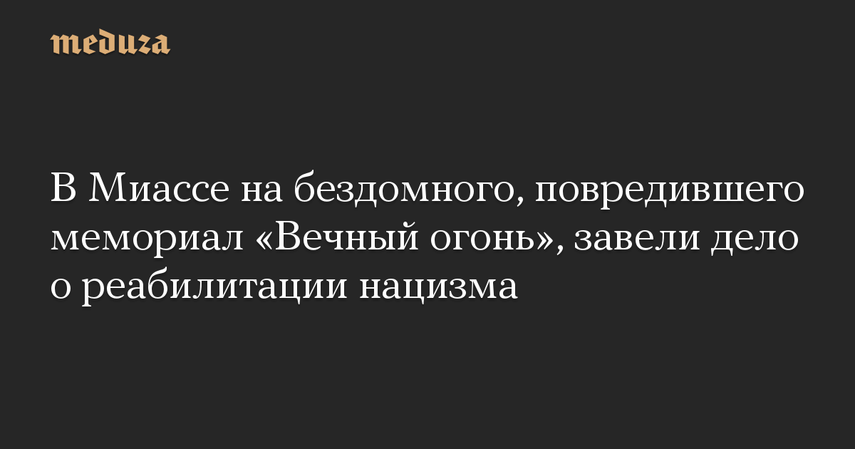 В Миассе на повредившего мемориал «Вечный огонь» завели уголовное дело о реабилитации нацизма (статья 354.1 УК РФ), сообщает Znak.com. Фигурант дела, по данным издания, 40-летний мужчина без определенного места жительства, который 30 сентября поджег венок, чтобы высушить носки. Горевший венок повредил элемент мемориала — пятиконечную звезду, ее пришлось демонтировать, чтобы привести в надлежащий вид.