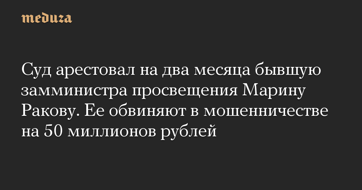 Суд арестовал на два месяца бывшую замминистра просвещения Марину Ракову. Ее обвиняют в мошенничестве на 50 миллионов рублей