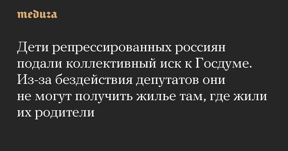Дети жертв советских репрессий подали в Верховный суд РФ коллективный иск к Госдуме. Они потребовали признать незаконным бездействие парламента, не исполняющего решение Конституционного суда РФ, по которому дети репрессированных, родившиеся в лагере или ссылке, имеют право получить жилье там, где семья жила на момент репрессий.