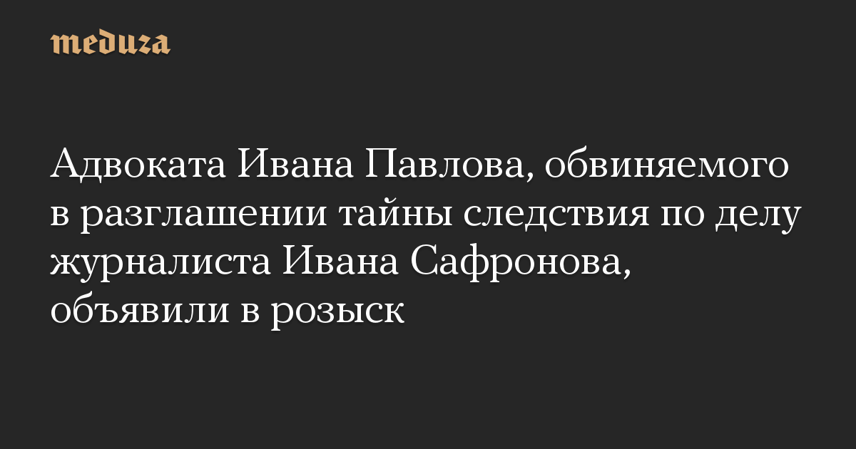 Адвоката Ивана Павлова, которого обвиняют в разглашении тайны следствия по делу его подзащитного, журналиста Ивана Сафронова, объявили в розыск. Об этом «Интерфаксу» сообщил сам Павлов.
