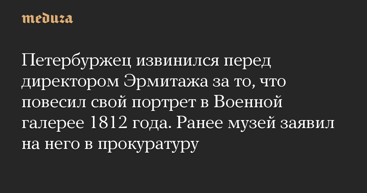 Петербуржец извинился перед директором Эрмитажа за то, что повесил свой портрет в Военной галерее 1812 года. Ранее музей заявил на него в прокуратуру