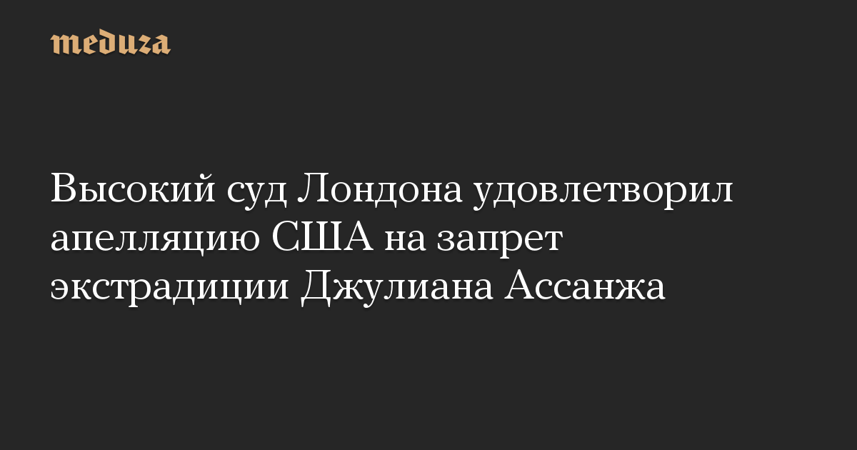 Высокий суд Лондона удовлетворил апелляцию Соединенных Штатов на решение о запрете экстрадиции в эту страну основателя Wikileaks Джулиана Ассанжа, сообщает Reuters.