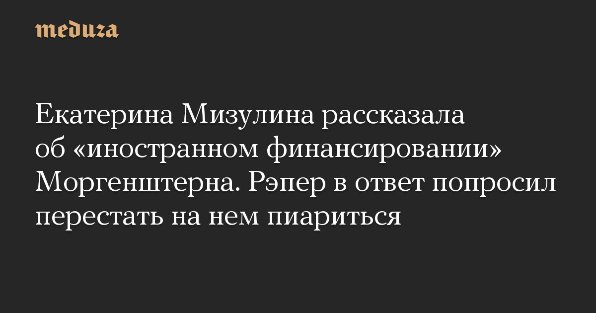 Глава Лиги безопасного интернета Екатерина Мизулина заявила, что рэпер Моргенштерн получает иностранное финансирование, а также файлы с темами, которые он должен затрагивать в своем творчестве. Об этом она рассказала в ютьюб-программе «А поговорить?» журналистки Ирины Шихман. При этом Мизулина не смогла привести источник этой информации.