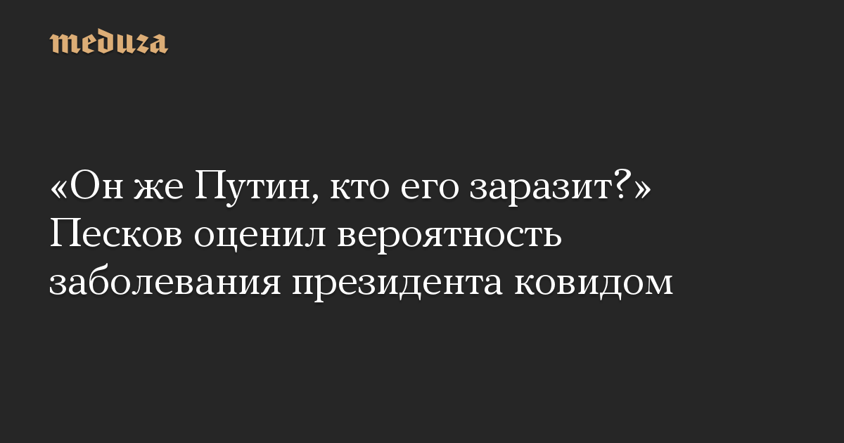 «Ну, слушайте — он же Путин, кто его заразит?» — сказал представитель Кремля, отвечая на вопрос журналистки, есть ли какой-то план на случай, если все-таки кто-то заразит президента (цитата по ТАСС). При этом Песков отметил, что о таком повороте событий ему «не хочется ни думать, ни говорить».