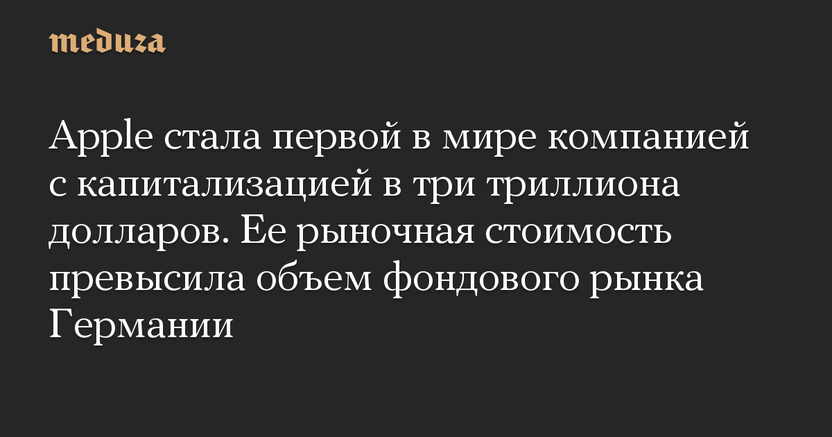 Apple стала первой в мире компанией с капитализацией в три триллиона долларов. Ее рыночная стоимость превысила объем фондового рынка Германии