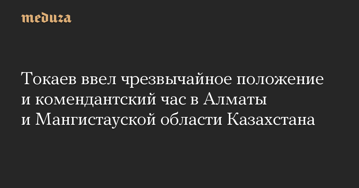 Президент Казахстана Касым-Жомарт Токаев подписал указы о введении режима чрезвычайного положения в городе Алматы и в Мангистауской области страны. Оба документа опубликованы на официальном сайте Токаева.