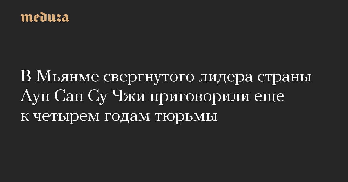 Суд в Мьянме приговорил бывшего лидера страны, лауреата Нобелевской премии Аун Сан Су Чжи к четырем годам тюремного заключения, сообщает BBC News.