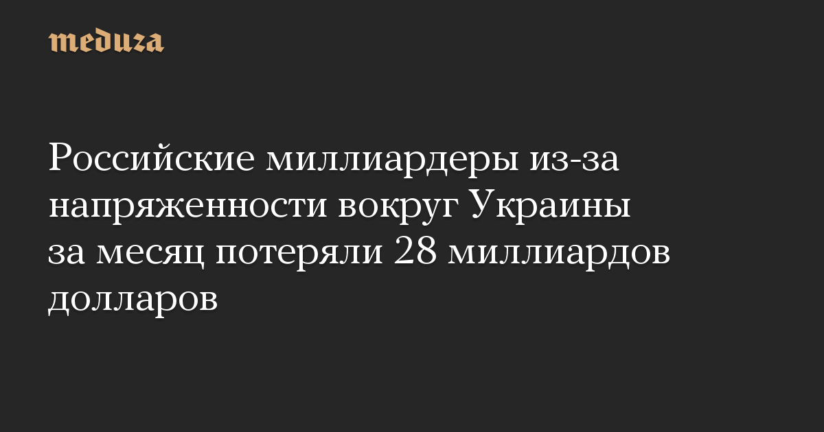 Совокупное состояние 104 российских миллиардеров с 20 декабря 2021 года по 25 января 2022-го сократилось на 27,9 миллиарда долларов на фоне обострения вокруг Украины и падения российского фондового рынка.