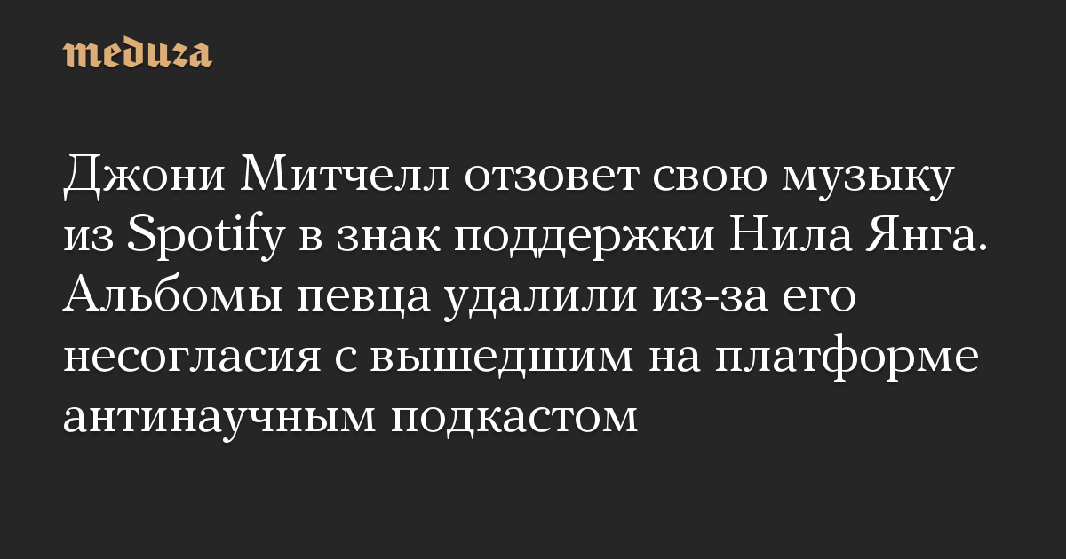 «Я решила удалить всю свою музыку со Spotify. Безответственные люди распространяют ложь, которая стоит жизни другим людям. Я солидарна с Нилом Янгом и международным научным и медицинским сообществом по этому вопросу», — написала Митчелл на своем сайте.