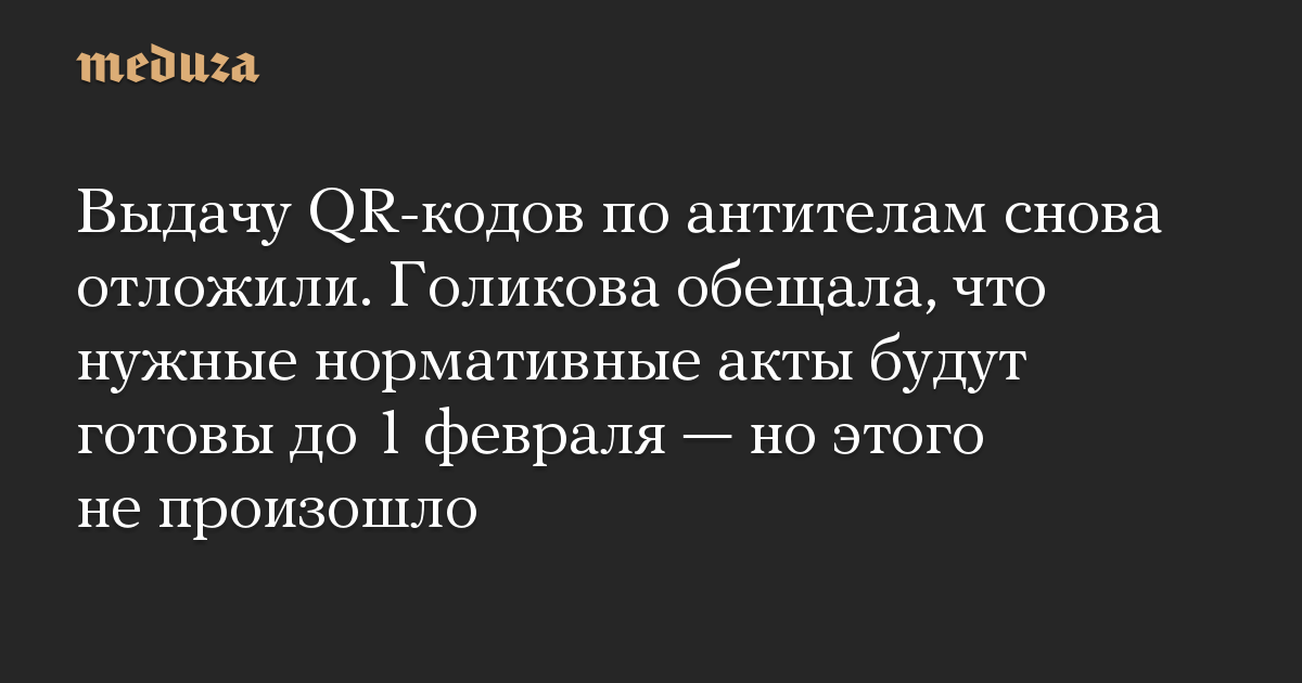 Выдачу QR-кодов по антителам снова отложили. Голикова обещала, что нужные нормативные акты будут готовы до 1 февраля — но этого не произошло