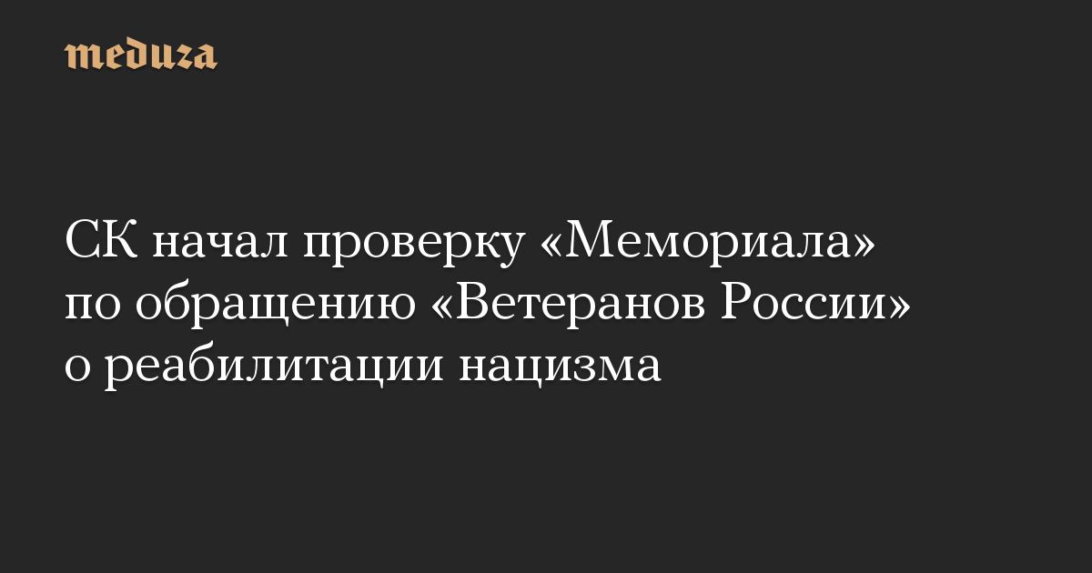 Следственный комитет РФ начал проверку «Мемориал» после обращения «Ветеранов России», потребовавших привлечь организацию к ответственности за реабилитацию нацизма.