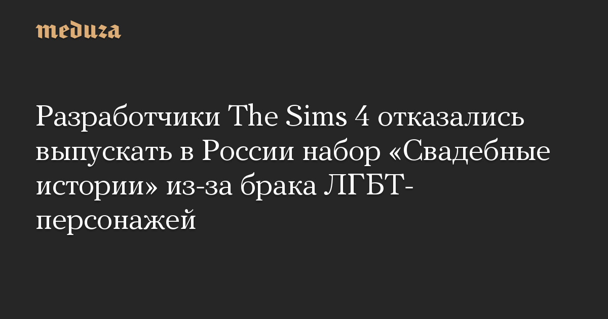 Разработчики компьютерной игры The Sims 4 решили отказаться от выпуска в России нового набора «Свадебные истории» (My Wedding Stories). Об этом говорится с обращении команды The Sims.