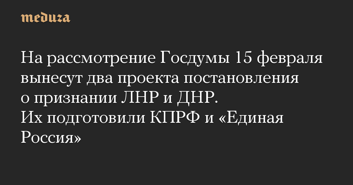 На рассмотрение Госдумы 15 февраля вынесут два проекта постановления о признании ЛНР и ДНР. Их подготовили КПРФ и «Единая Россия»