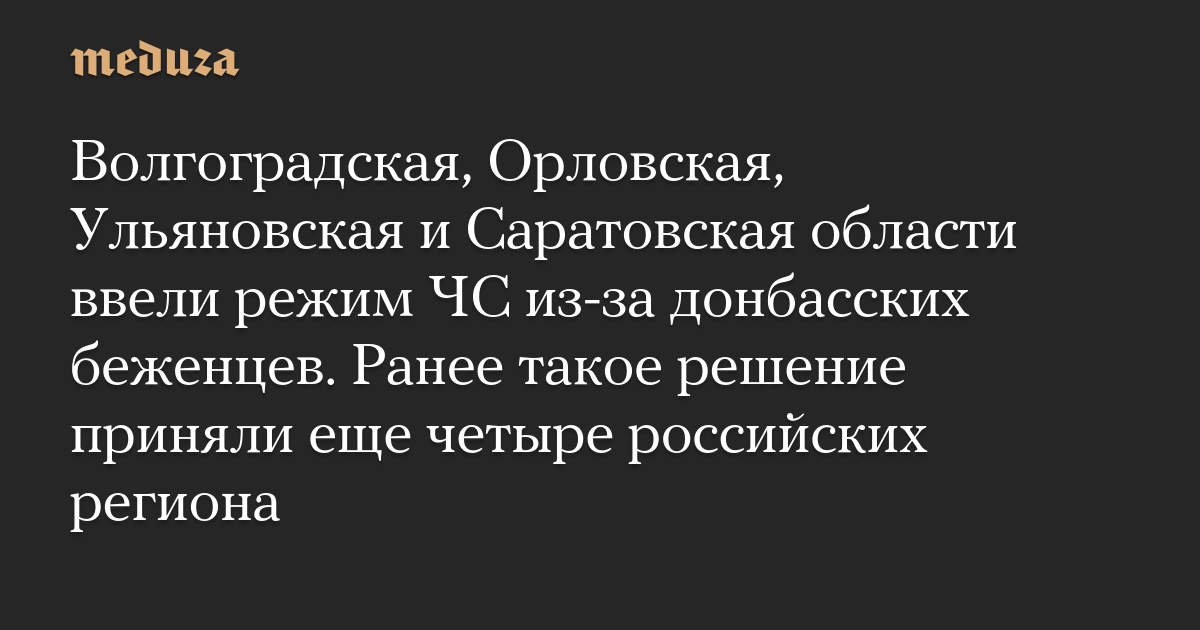 Волгоградская, Орловская, Ульяновская и Саратовская области ввели режим ЧС из-за донбасских беженцев. Ранее такое решение приняли еще четыре российских региона