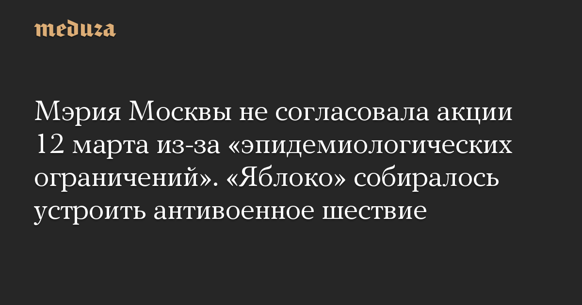Мэрия Москвы не согласовала акции 12 марта из-за «эпидемиологических ограничений». «Яблоко» собиралось устроить антивоенное шествие