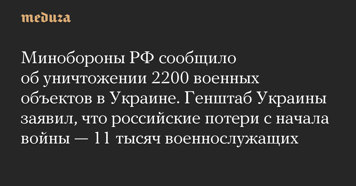 Минобороны РФ сообщило об уничтожении 2200 военных объектов в Украине. Генштаб Украины заявил, что российские потери с начала войны — 11 тысяч военнослужащих