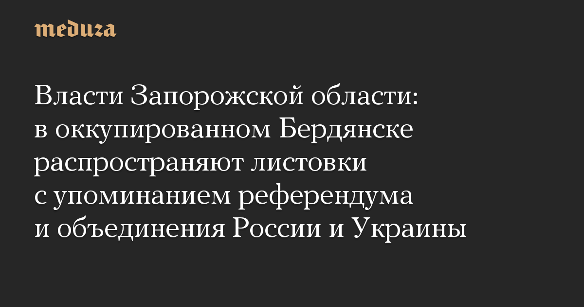 Власти Запорожской области Украины опубликовали со ссылкой на СБУ фотографии листовок, которые, как утверждается, распространяют в оккупированном Бердянске российские власти. Оперативно найти независимое подтверждение подлинности этих материалов «Медузе» не удалось.