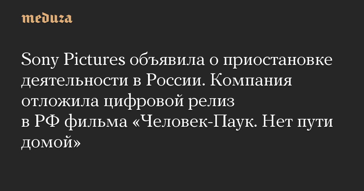 Sony Pictures объявила о приостановке деятельности в России. Компания отложила цифровой релиз в РФ фильма «Человек-Паук. Нет пути домой»