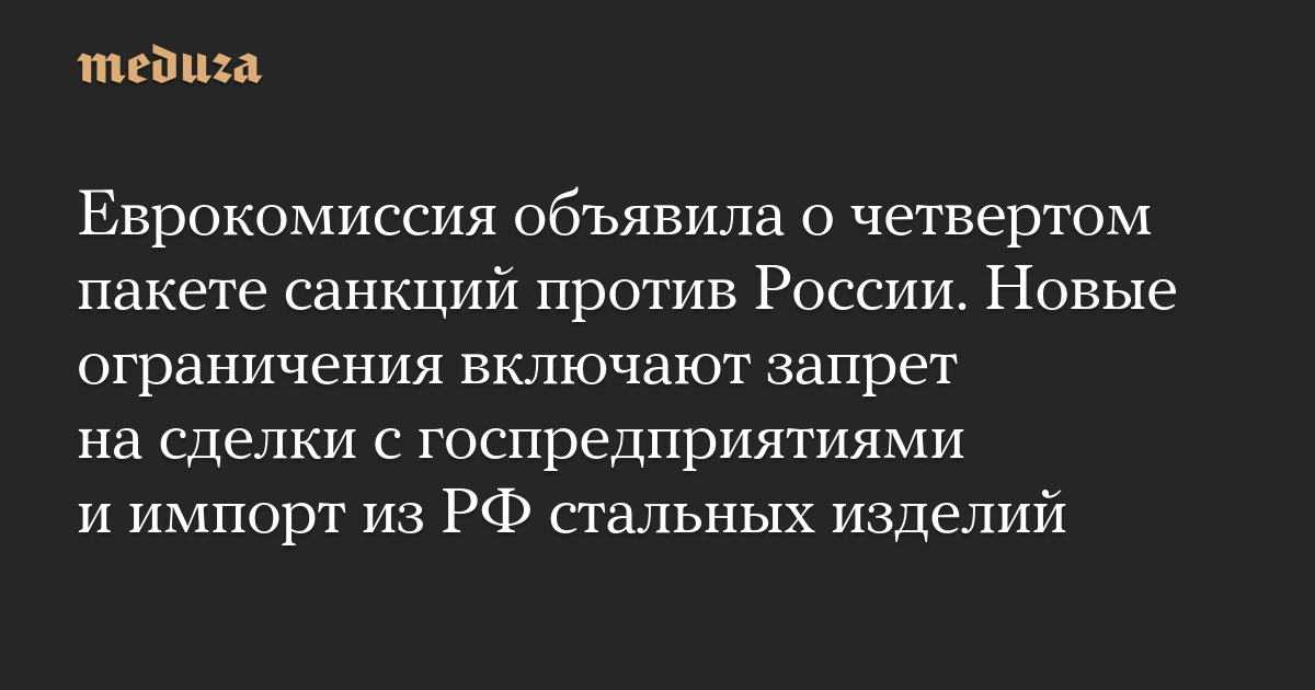 Еврокомиссия объявила о четвертом пакете санкций против России. Новые ограничения включают запрет на сделки с госпредприятиями и импорт из РФ стальных изделий
