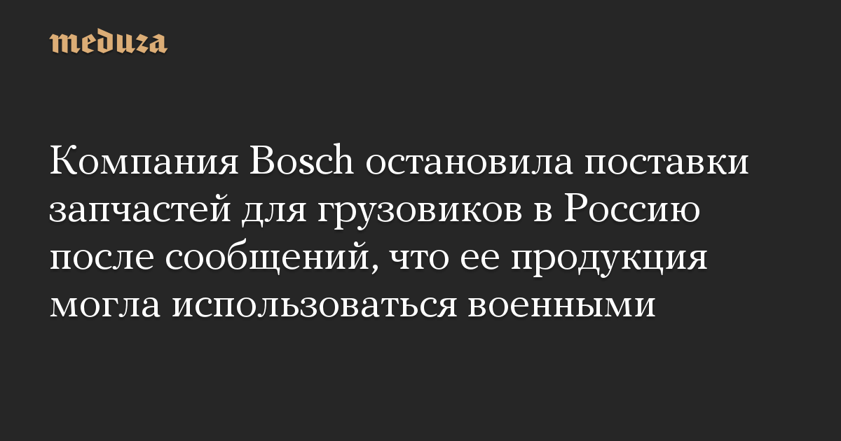 Немецкая компания Bosch остановила поставки деталей для грузовых автомобилей в Россию после информации о том, что ее продукция могла использоваться в военных целях. Об этом со ссылкой на заявление компании сообщает Bloomberg.