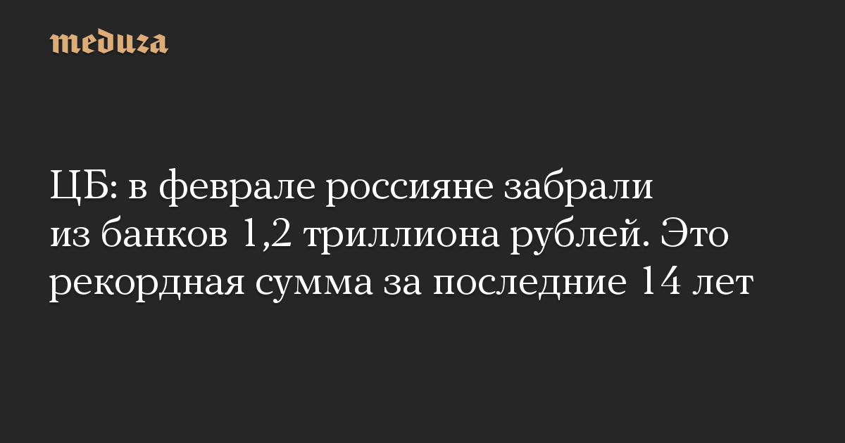 ЦБ: в феврале россияне забрали из банков 1,2 триллиона рублей. Это рекордная сумма за последние 14 лет