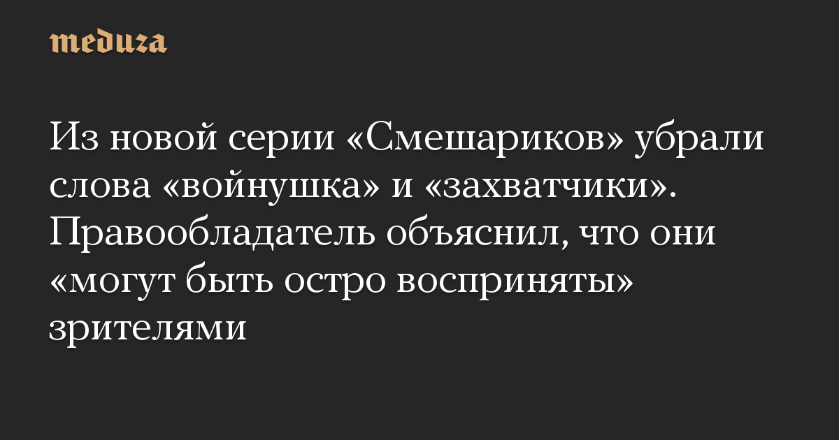 Из новой серии детского мультсериала «Смешарики» убрали слова «войнушка» и «захватчики», поскольку они «могут быть остро восприняты» зрителями. Об этом изданию «Бумага» рассказали в пресс-службе группы компаний «Рики» — правообладателя бренда «Смешарики».