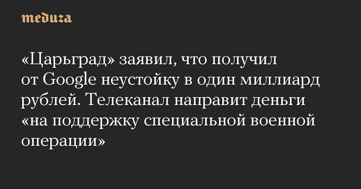«Царьград» заявил, что получил от Google неустойку в один миллиард рублей. Телеканал направит деньги «на поддержку специальной военной операции»