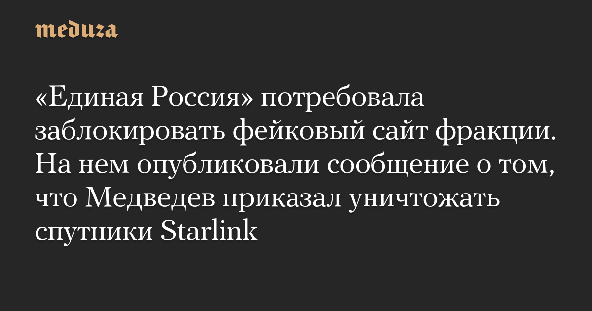 «Единая Россия» потребовала заблокировать фейковый сайт фракции. На нем опубликовали сообщение о том, что Медведев приказал уничтожать спутники Starlink