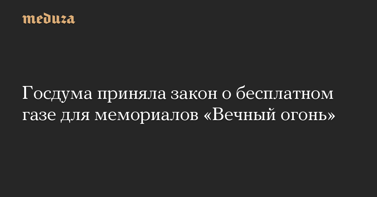 Нижняя палата российского парламента приняла в третьем, окончательном чтении закон, который позволит сделать бесплатным газ для работы мемориалов «Вечный огонь», внесенных в реестр Минобороны РФ.