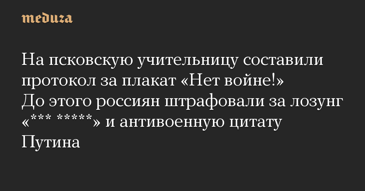 На псковскую учительницу составили протокол за плакат «Нет войне!» До этого россиян штрафовали за лозунг «*** *****» и антивоенную цитату Путина