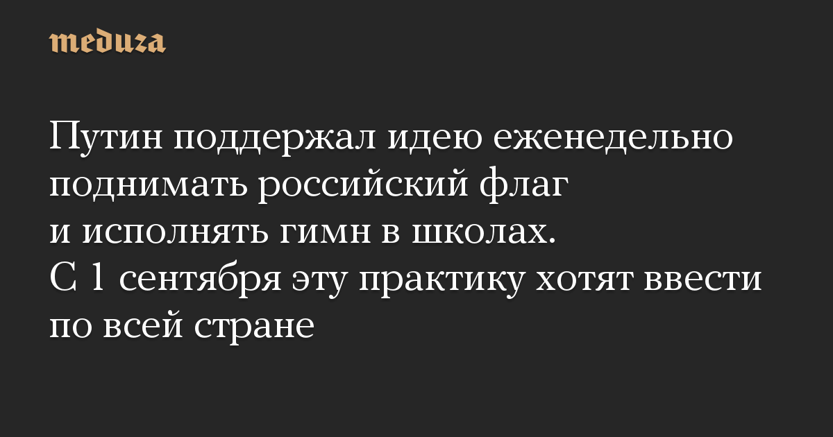 Президент России Владимир Путин поддерживает идею поднимать государственный флаг и исполнять гимн в российских школах. Об этом Путин заявил во время заседания наблюдательного совета автономной некоммерческой организации (АНО) «Россия — страна возможностей».