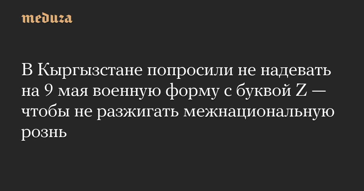 Жителям Кыргызстана рекомендовали во время празднования Дня Победы не надевать военную форму и костюмы с символом Z, поскольку они «способствуют разжиганию межнациональной розни». Об этом говорится в обращении на сайте государственного комитета национальной безопасности Кыргызстана.