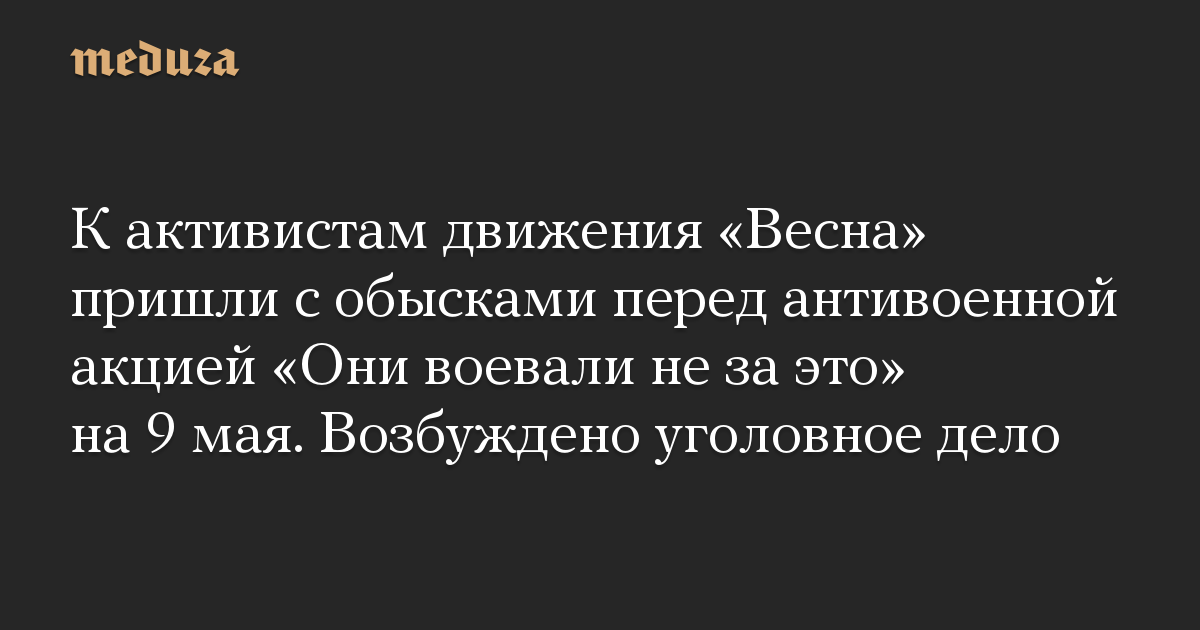 К активистам движения «Весна» пришли с обысками перед антивоенной акцией «Они воевали не за это» на 9 мая. Возбуждено уголовное дело