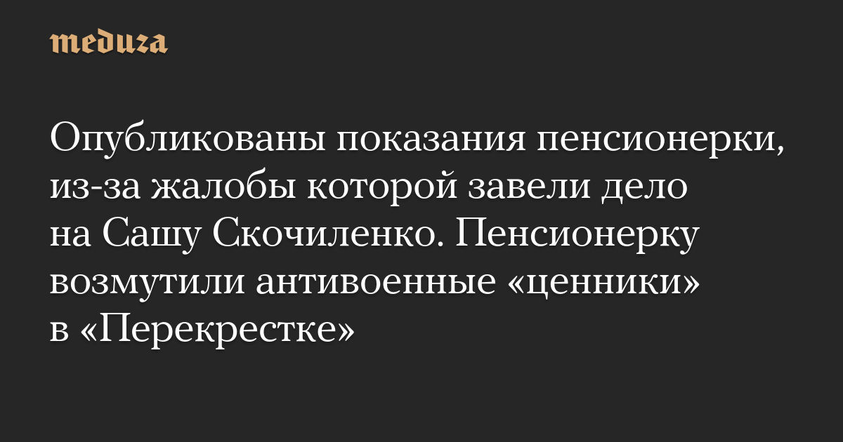 Издание «Бумага» опубликовало показания 72-летней петербурженки, из-за жалобы которой на антивоенные «ценники» в магазине «Перекресток» было возбуждено уголовное дело против художницы Саши Скочиленко.