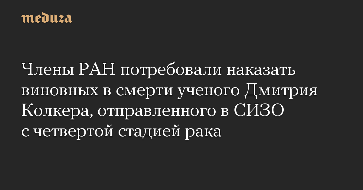 Члены «Клуба 1 июля» — неформального сообщества академиков и членов-корреспондентов Российской академии наук (РАН) — потребовали привлечь к ответственности виновных в смерти ученого Дмитрия Колкера. Об этом говорится в заявлении, опубликованном на сайте «Клуба 1 июля».