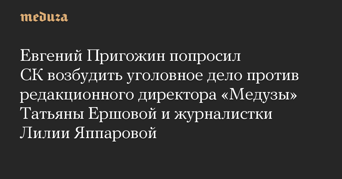 Предприниматель Евгений Пригожин попросил председателя Следственного комитета провести проверку и «при наличии оснований» возбудить уголовное дело против редакционного директора «Медузы» Татьяны Ершовой и специального корреспондента издания Лилии Яппаровой. Об этом сообщила пресс-служба принадлежащей Пригожину компании «Конкорд».