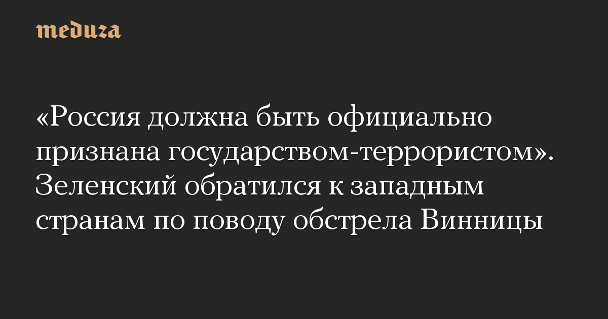 Выступление президента касалось ракетного обстрела города Винница, в результате которого погибли как минимум 23 человека, включая трех детей. В обращении Зеленский потребовал признать Россию «государством-террористом» и создавать международный трибунал по военным преступлениям в Украине.