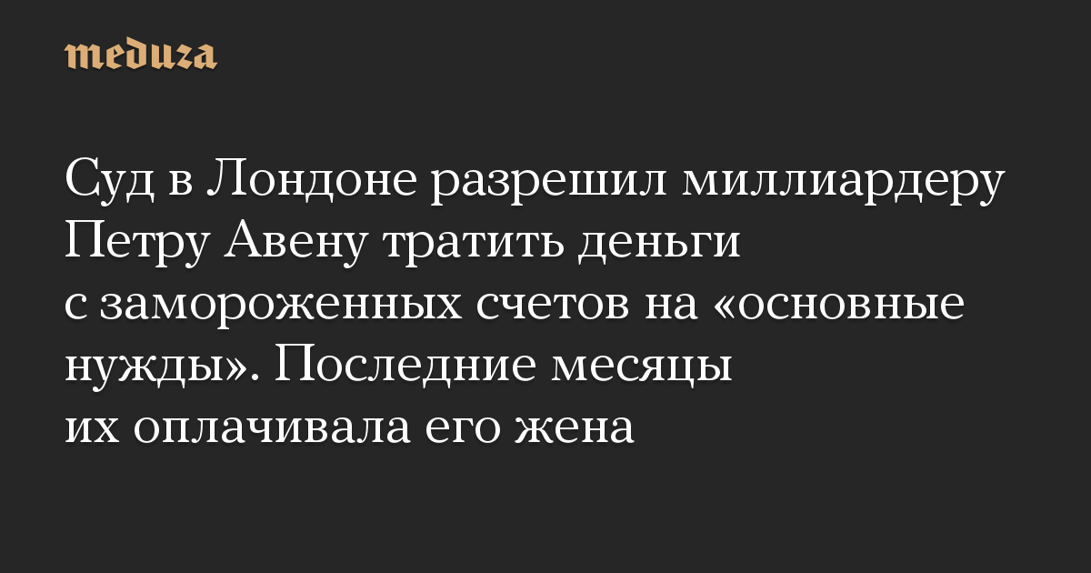 Как сообщает Bloomberg, суд разрешил российскому миллиардеру, попавшему под санкции, оплачивать «основные нужды». Адвокаты настаивали на полном размораживании банковских счетов. Национальное агентство по борьбе с преступностью (NCA), заморозившее счета Авена, предлагало оставить все в силе, чтобы провести расследование в Великобритании и других странах.