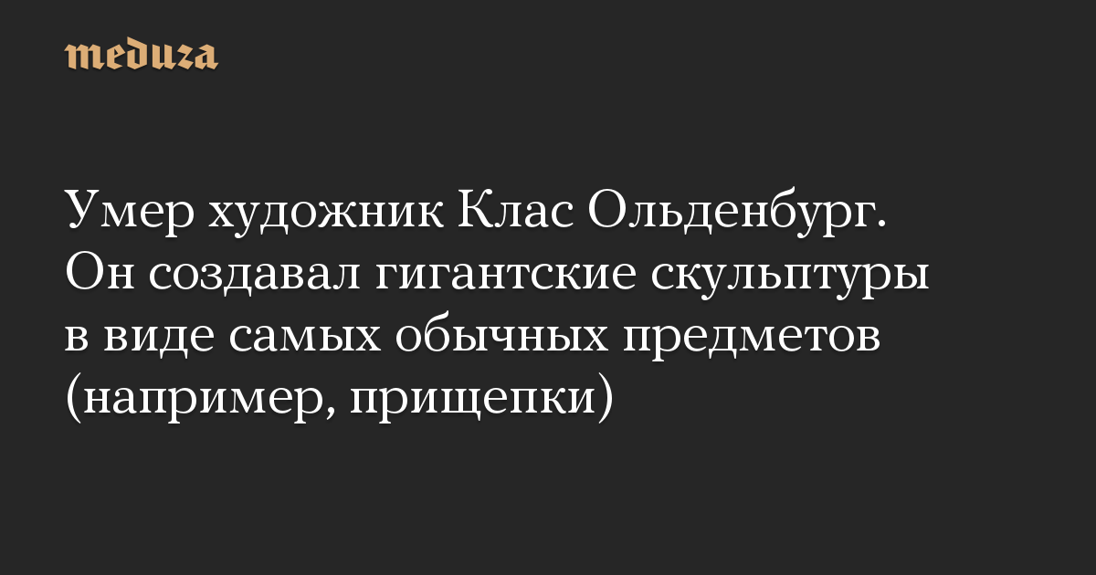 Американский художник шведского происхождения Клас Ольденбург умер в возрасте 93 лет. Об этом сообщило издание Art News со ссылкой на представителей двух галерей, выставлявших работы художника.