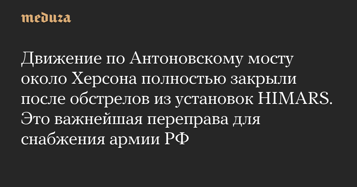 Движение по Антоновскому мосту около Херсона полностью закрыли после обстрелов из установок HIMARS. Это важнейшая переправа для снабжения армии РФ