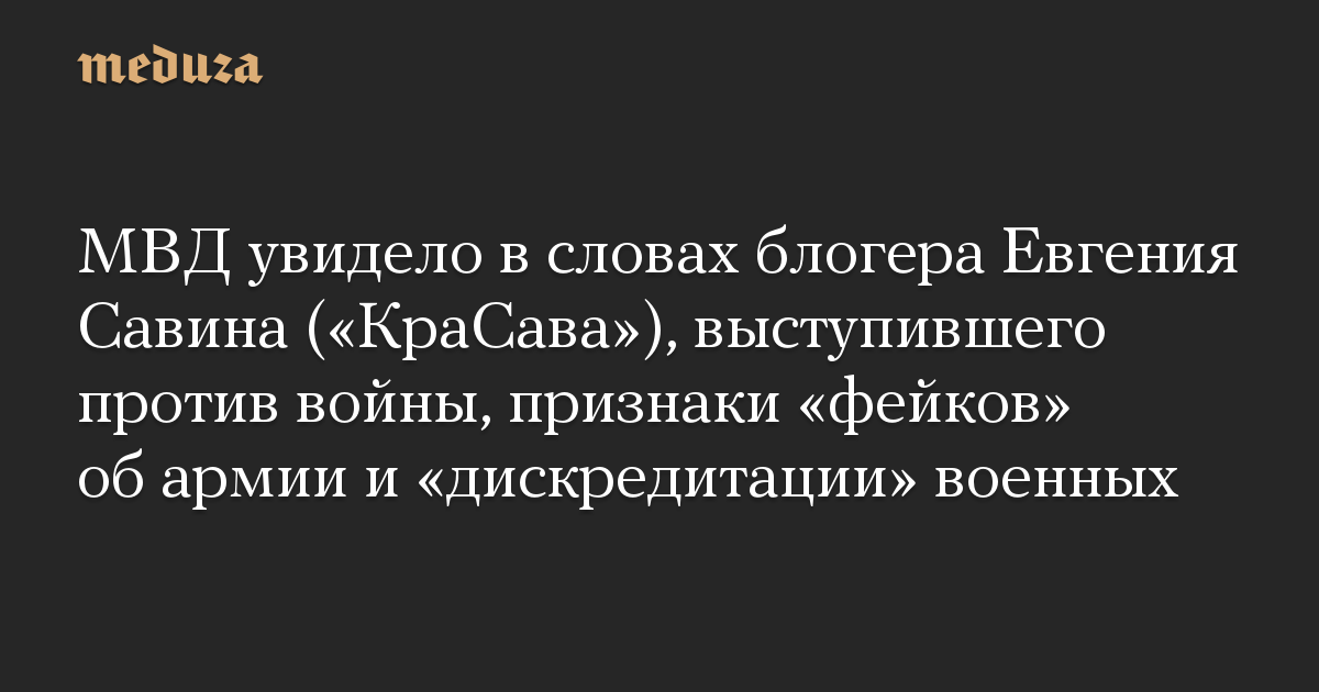 МВД увидело в словах блогера Евгения Савина («КраСава»), выступившего против войны, признаки «фейков» об армии и «дискредитации» военных