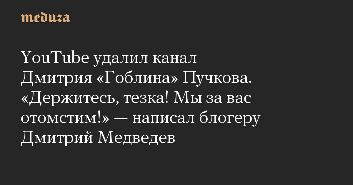 YouTube удалил канал Дмитрия «Гоблина» Пучкова. «Держитесь, тезка! Мы за вас отомстим!» — написал блогеру Дмитрий Медведев