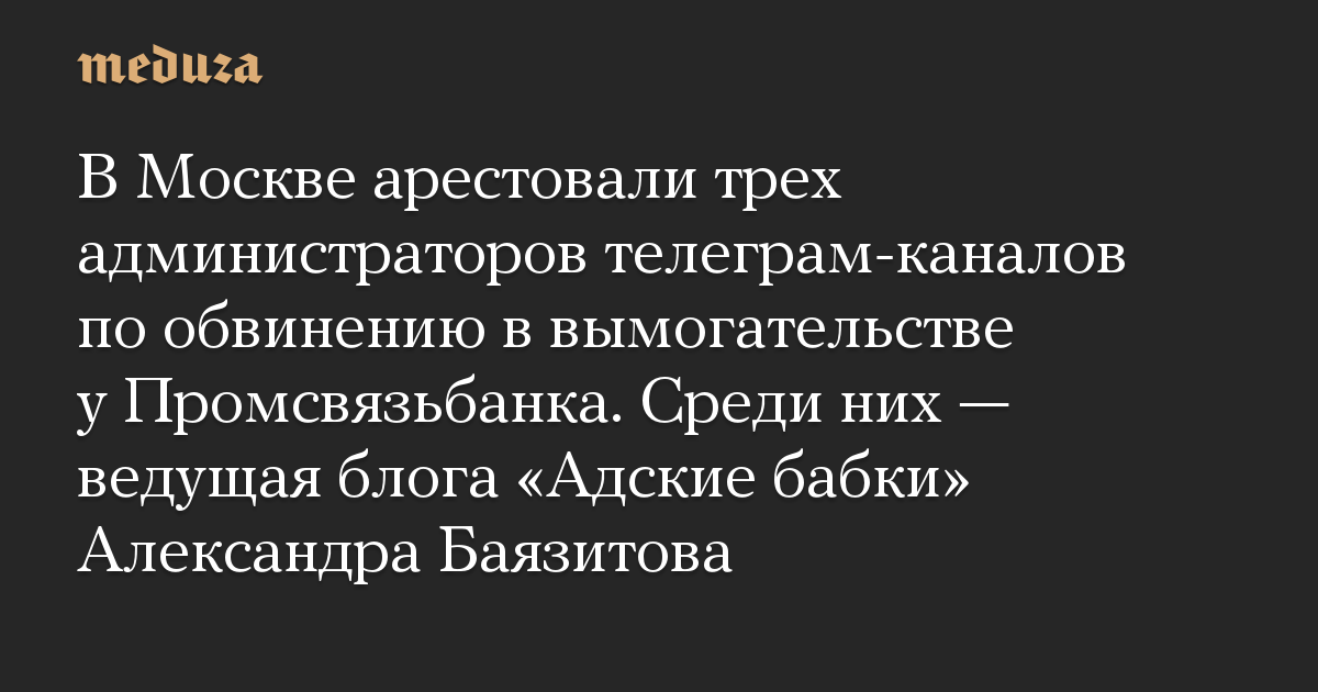 В Москве арестовали трех администраторов телеграм-каналов по обвинению в вымогательстве у Промсвязьбанка. Среди них — ведущая блога «Адские бабки» Александра Баязитова