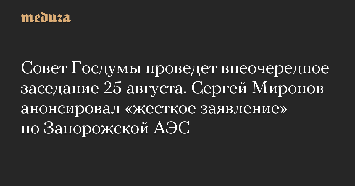 Совет Госдумы проведет внеочередное заседание 25 августа. Сергей Миронов анонсировал «жесткое заявление» по Запорожской АЭС