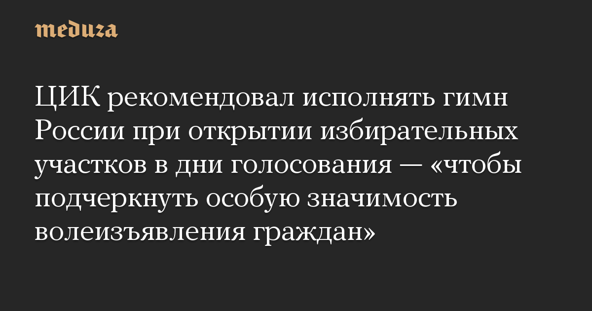 ЦИК рекомендовал исполнять гимн России при открытии избирательных участков в дни голосования — «чтобы подчеркнуть особую значимость волеизъявления граждан»