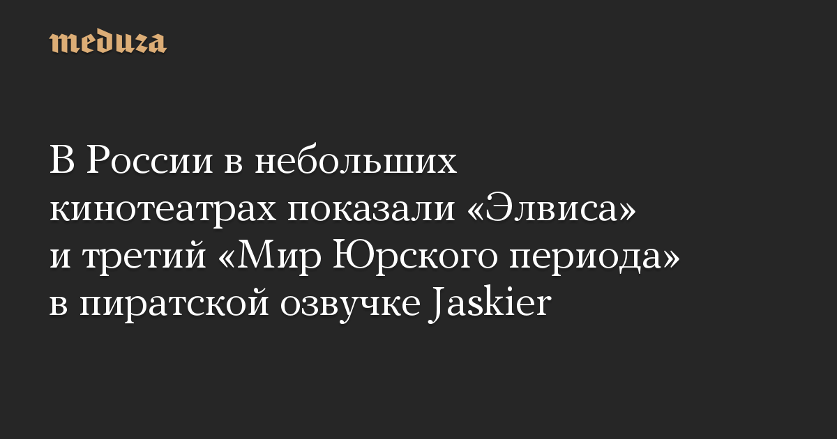 Небольшие кинотеатры в разных городах России показали фильмы «Элвис» и «Мир Юрского периода: Господство» в пиратской озвучке от студии Jaskier. Об этом сообщает DTF, ссылаясь на представителя Jaskier.