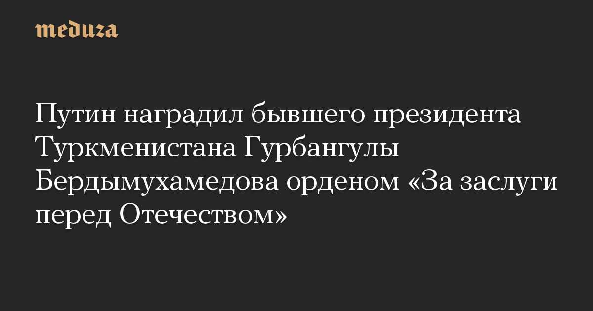 Президент России Владимир Путин наградил орденом «За заслуги перед Отечеством» IV степени бывшего президента Туркменистана Гурбангулы Бердымухамедова. Соответствующий указ опубликован на официальном интернет-портале правовой информации.