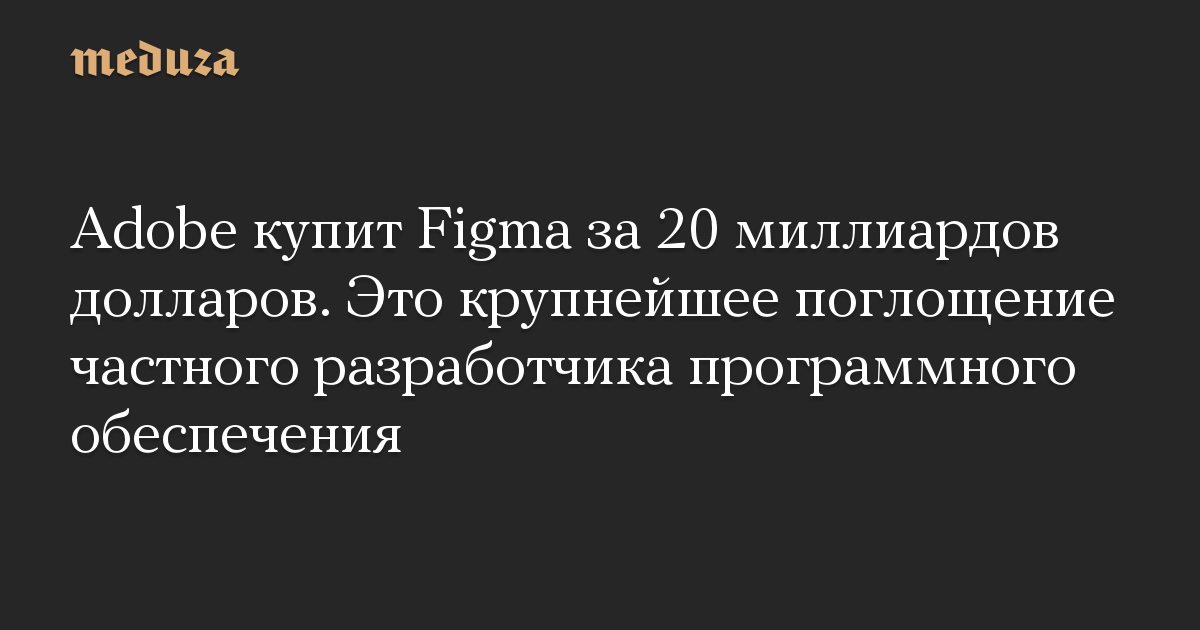 Adobe сообщил на своем сайте, что купит Figma за 20 миллиардов долларов: часть суммы будет выплачена в денежном выражении, а часть — в виде акций. Ожидается, что сделка будет закрыта в 2023 году после того, как ее одобрят власти. По оценке агентства Bloomberg, сделка станет крупнейшим в истории поглощением частной компании по разработке программного обеспечения.