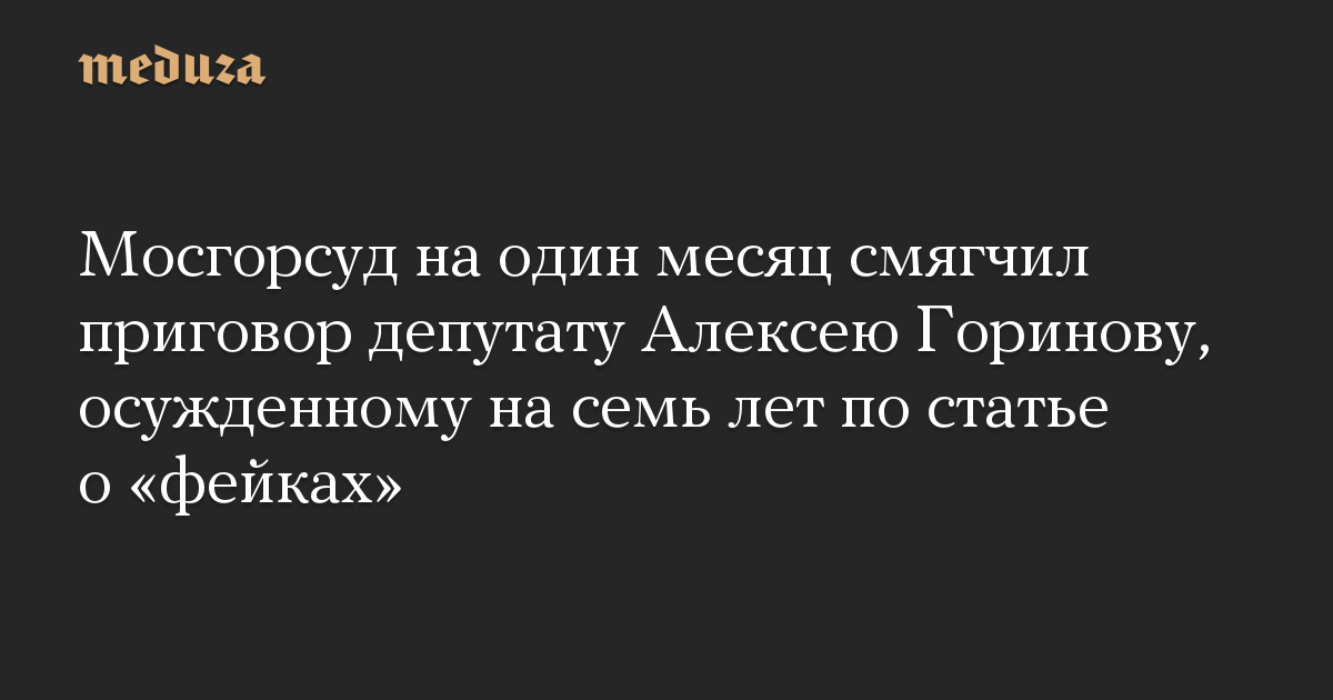 Мосгорсуд сократил на один месяц приговор муниципальному депутату Алексею Горинову, осужденному по статье о «фейках» про российскую армию — до шести лет и 11 месяцев лишения свободы.